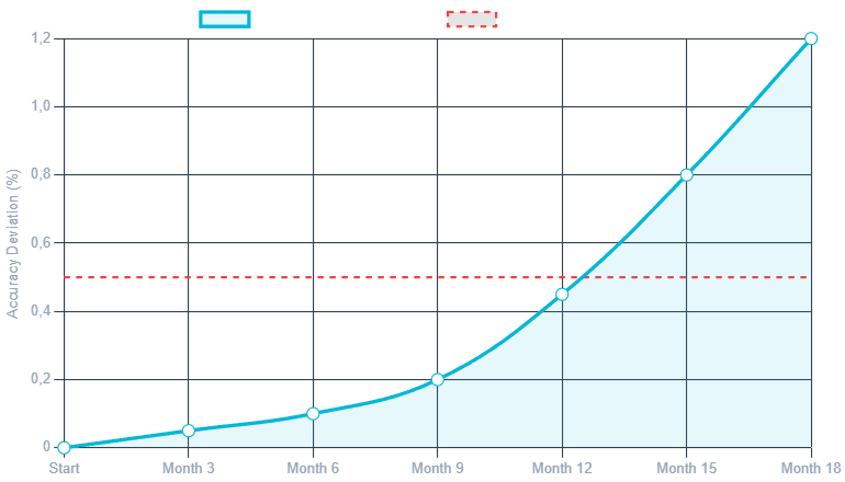 Electronic drift is rarely linear. As shown in the graph, a meter may remain stable for months (Phase A) before environmental factors cause a rapid acceleration in error (Phase B), crossing the tolerance threshold (Phase C).
